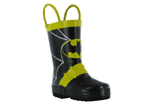 Little boys love to play in the rain, and most have never met a puddle they didn't love. That means wet, cold feet unless you can talk them into wearing rain boots. These Batman rain boots may make it a little easier to coax him into wearing rain gear. Super heroes are an easy sell with little boys. The bold yellow trim on the black background catches the eye, and the batman logo seals the deal. They don't really care that the boots have deep treads on the bottoms to keep them stable, nor do they care about the hand-sized stirrups that make them easy to pull on, but they DO care about having Batman on their shoes; so don't bother to share the practical side, just show him Batman.