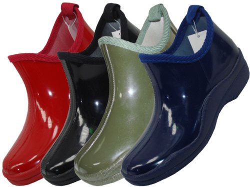 Short rain boots in solid black. Thick, durable rubber will keep your feet dry for years to come. Short rain boot has textured soles keep you from slipping in the rain. Rises up to ankle height for coverage from splashes and puddles. Available Sizes Include: 5-10.