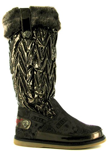 Don Ed Hardy's tattoo designs have taken over mainstream fashion. Christian Audigier has made the once underground designs into a recognizable brand. The tattoo inspired line of clothing and shoes shares his name. These winter boots feature suede uppers with the love kills slowly tattoo featured on both sides. This warm winter boot contains a synthetic patent and suede upper, a full inside zip for easy on/off, cuff detail at top of shaft, and a faux fur lining to keep you warm all winter long. It features a lightly padded insole and a rubber sole. The heel measures approximately 3/4", shaft measures approximately 14" in height, and the boot opening measures approximately 15 1/2" in circumference. Style name: Oslo.