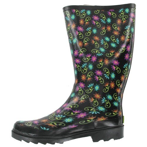 Rain or shine, these color-wonderful boots will keep you dry or cool while giving your spirits a lift. Black/multi. Casual weather boot. Rubber pull-on 12 in. high, 15 in. circumference upper. Reinforced round toe. Side strap/buckle detail. Contrast trim.